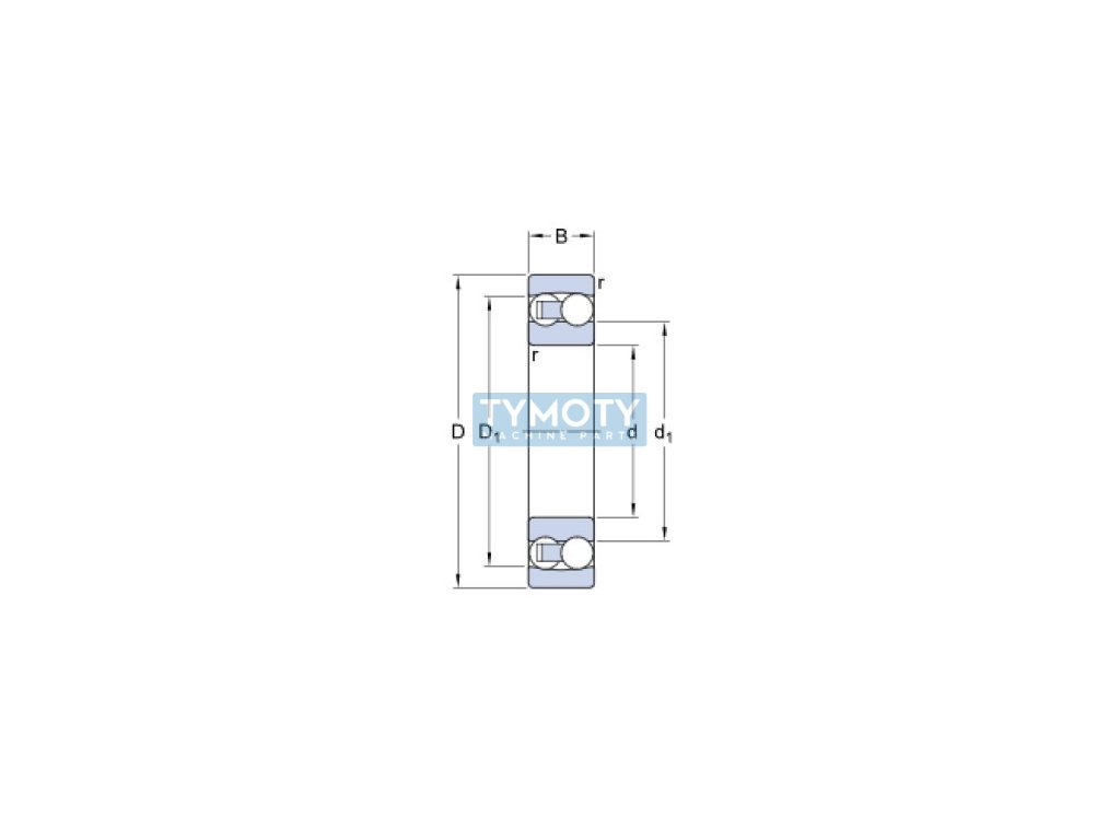 SKF 2208 ETN9 - non-separable double row self-aligning ball bearing with optimized internal design, plastic cage made of glass fiber reinforced polyamide 6.6 guided by two rows of balls and with normal radial clearance.The outer ring has a common groove that allows the bearing to be tilted and compensate for misalignment or deflection of the shaft relative to the housing. The bearing can operate at temperatures up to +120 °C.