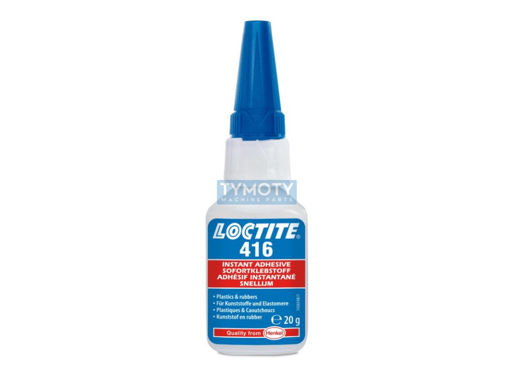 LOCTITE 416 je transparentní, bezbarvé, univerzální vteřinové lepidlo na bázi ethylu s vysokou viskozitou. Vhodné pro kovy, pryže a plasty a také vhodné pro polyolefiny v kombinaci s primerem LOCTITE SF 770 nebo LOCTITE SF 7239. Manipulační pevnost má za 20 - 40 sec.